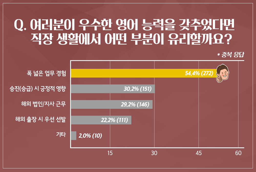 '영어 능력이 뛰어나다면 현재 직장 생활이 달라질 것 같은가?'라는 질문에 전체 응답자의 54.4%가 '폭넓은 업무 경험을 얻을 수 있다'라고 답했습니다. 그 외에도 승진(승급)에 긍정적인 영향을 준다거나, 해외 법인/지사에 근무할 수 있는 기회가 주어질 수 있다는 답변이 뒤를 이었습니다.
