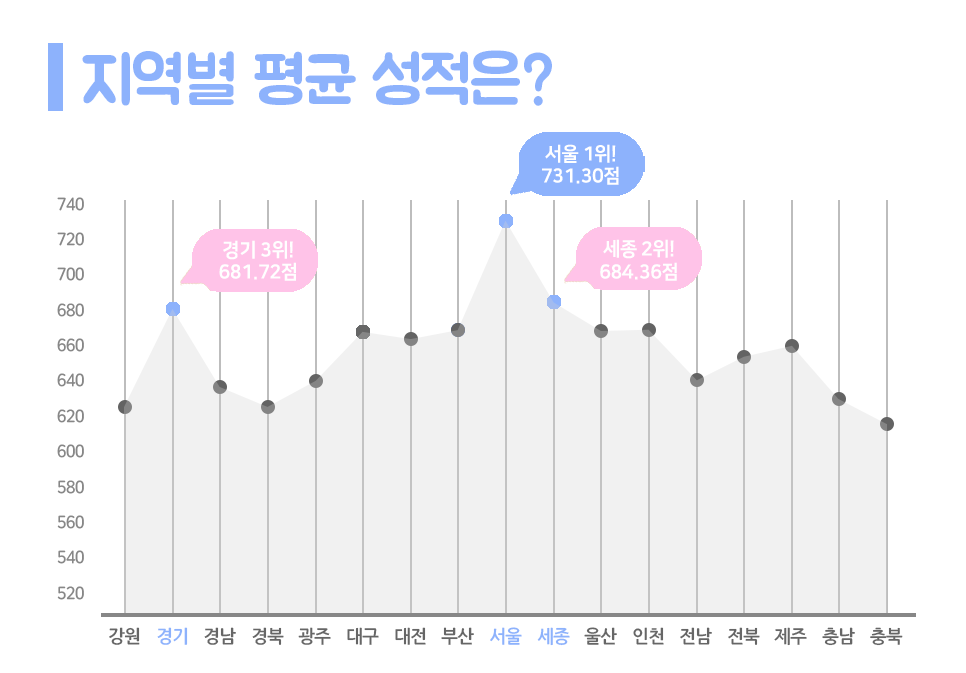 '서울'이 이번에도 변함없이 731.30점으로 지역별 평균 성적 1위를 차지했는데요. 지난 회차와 비교하면 6.69점 하락한 점수입니다. 지난 회차에 3위를 기록했던 '세종'이 684.36점을 기록하며 2위로 올라섰고, 2위였던 '경기'는 681.72점을 기록해 이번 회차에서 3위를 기록했습니다. 1, 2위의 성적 격차는 46.94점, 2, 3위의 성적 격차는 2.64점입니다.