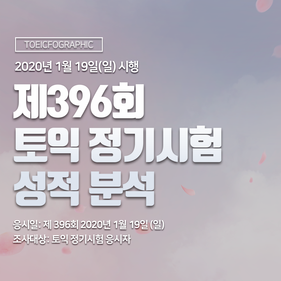 1월 19일에 치러진 '제396회 토익 정기시험 성적'을 공개합니다! 해당일에 시험을 치르셨다면 개인 성적을 확인해 보시고 전체 평균에서 내 위치가 어디쯤에 위치하고 있는지 확인해 보시기 바랍니다. '제396회 토익 정기시험 성적 분석' 함께 확인하실까요?