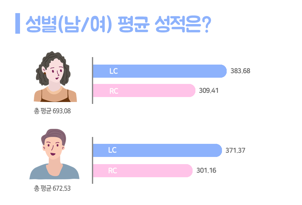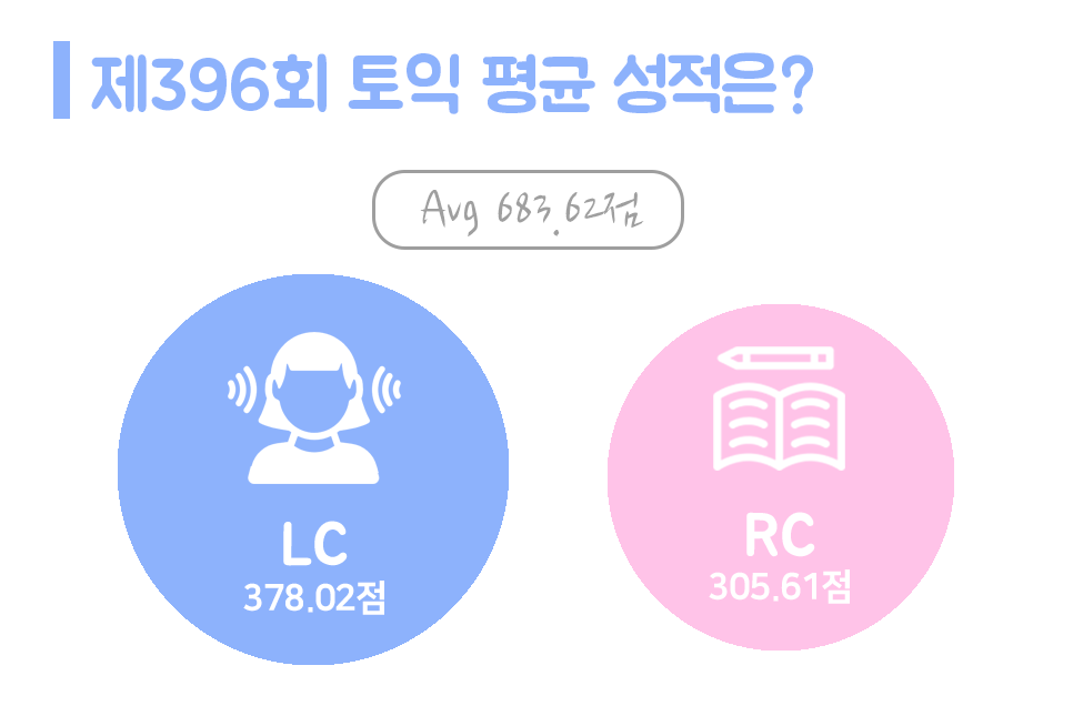 396회 평균 성적은 683.62점으로 지난 회차보다 10.6점 하락했습니다. 부문별로 확인해보면 LC 평균 점수는 378.02점으로 지난 회차 대비 3.75점 하락, RC 평균 점수는 305.61점으로 지난 회차 대비 6.85점 하락했습니다.
