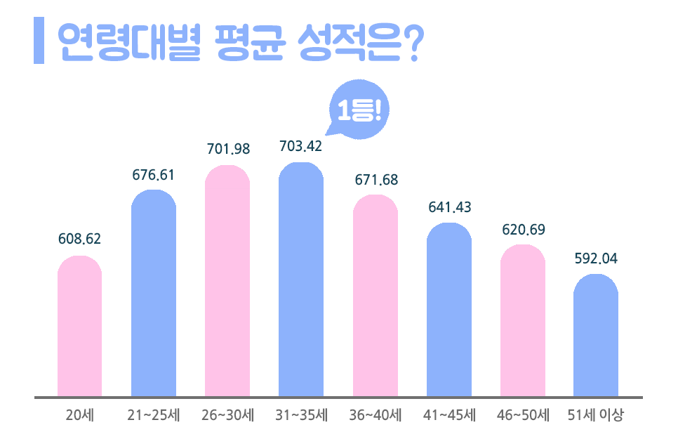 이번 회차에서도 31~35세 연령대가 703.42점으로 1위 자리를 수성했는데요. 지난 회사와 비교하면 16.66점 하락한 점수입니다. 불과 1.44점 낮은 점수 차이로 26~30세 연령대가 701.98점을 얻어 2위를 차지했고, 21~25세 연령대가 676.61점으로 3위를 차지했습니다.
