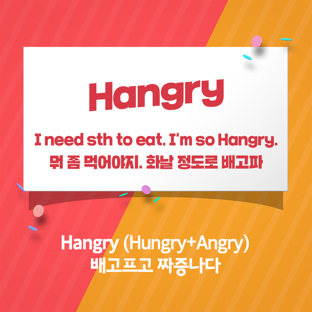 배고픔으로 인해 신경이 극도로 예민해진 상황, 다들 한 번쯤 경험해 본 적 있을 텐데요. 영미권에서는 이런 상황을 'Hungry' 보다 강한 의미로 'Hangry'라고 표현합니다. 배가 너무 고파서 화가 난다는 의미 또는 화가 날 정도로 배가 고프다는 말로 자주 쓰이는데요. 혹시 "I’m hangry!"라고 외치는 외국인 친구가 있다면, 가급적 빠르게 인근 식당을 찾아가시길 추천합니다. :)