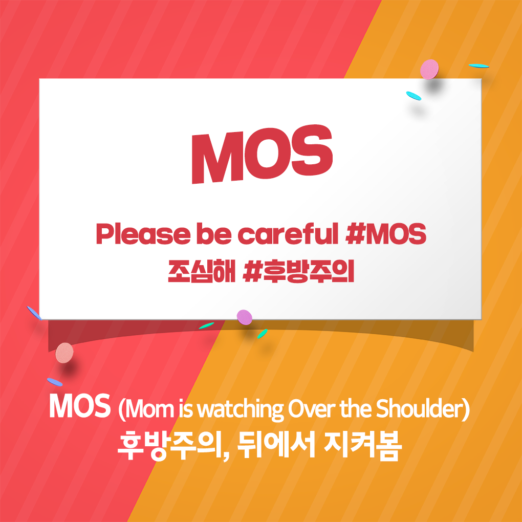 온라인에서 게시물을 확인할 때 종종 접하는 신조어 '후방주의' 입니다. 요즘은 직장에서도 '뒤에서 보고 있을 상사를 조심하라'는 뜻으로 쓰이기도 합니다. 다른 누군가에게 보이면 곤란할 수 있는 이미지나 동영상을 확인할 때 덧붙이는 단어인데요. 외국에서는 같은 의미로 'M.O.S'라는 단어를 사용합니다. 때에 따라서 D.O.S(Dad is watching Over the Shoulder)라고도 쓰이는데 '부모님이 보고 있다'는 말의 위압감(?)은 국내나 해외나 비슷한 것 같네요.