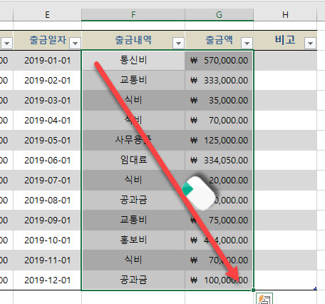 현금입출금기록 및 분석표의 출금 내역과 출금액 항목을 시트보호하려면