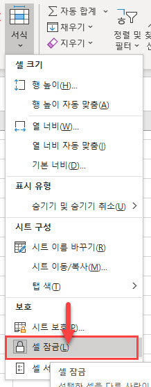 2. 선택한 범위를 먼저 편집이 가능하도록 [홈] > [셀] 그룹 > [서식] > [셀 잠금]을 클릭합니다.
