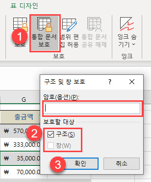 2. [구조 및 창 보호] 대화 상자 > [보호할 대상]의 [구조] 항목이 체크되어 있는지 확인합니다.