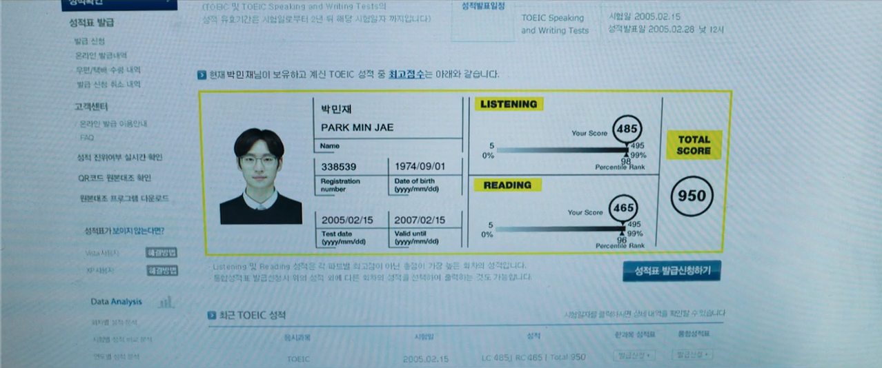 9급 공무원으로 일하는 현재 상황에 만족하는 주인공 민재. 극 중에서 민재는 이른바 '영어 실력자'로 등장합니다. 영화 초반에 민재가 영어학원에서 본인의 TOEIC 성적 유효기간(2년)을 확인하는 장면이 나오는데요. 과연 민재의 TOEIC 성적은 몇 점일까요? 화면 속 민재의 성적표를 보면 답을 알 수 있습니다. 무려 950점인데요! 옥분 할머니가 왜 민재에게 영어를 배우려 했는지, 민재의 영어 실력을 가늠할 수 있는 장면이 아닐까 싶습니다. 과연 옥분 할머니는 '영어 실력자' 민재에게 영어를 배울 수 있었을까요? 옥분 할머니가 민재에게 영어를 배우려는 이유, 영어로 꼭 하고 싶은 말이 궁금하다면 지금 바로 감동과 재미가 있는 <아이캔스피크>를 보러 GO GO!