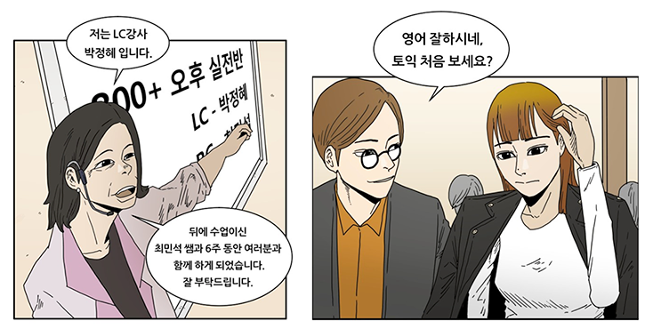 아픔을 가진 두 주인공은 TOEIC 학원에서 마주치며 서로를 이해하고 사랑을 키워나가는데요. <방백남녀>는 남자와 여자의 심리를 세심하게 묘사하고, 차이를 극명하게 드러냈다는 독자들의 평을 받았습니다. 주인공들이 가진 아픔은 현실에서 누구나 한 번쯤 가질 수 있는 걱정과 고민이라 많은 구독자의 공감과 몰입을 끌어냈다고 하는데요.