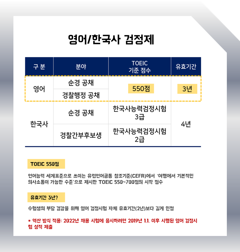 경찰청에서는 '유럽언어공통참조기준(CEFR)'에서 명시한 '여행에서 기본적인 의사소통이 가능한 수준'인 토익 550~700점의 최저 점수를 '순경 공채'와 '경찰행정 경채'의 토익 기준 점수(550점)로 정했다고 밝혔는데요. 그런가 하면 토익 성적 유효기간을 보편적으로 적용되는 2년이 아닌 3년으로 늘려 수험생의 부담 경감과 편의를 지원하고 있습니다. 2022년 경찰공무원 시험을 준비하고 있다면 2019년 1월 1일 이후의 토익 성적표를 영어 검정시험 성적으로 제출할 수 있다는 사실! 꼭 기억해 주세요.