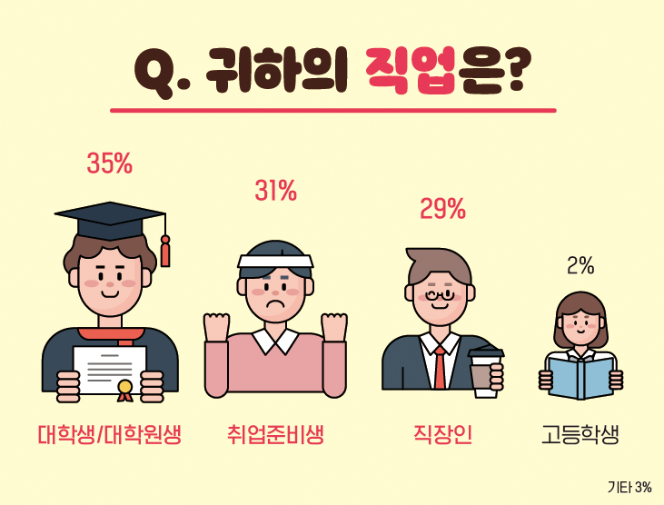 이번 설문에서는 '대학생, 대학원생'의 응답률이 35%로 가장 높았습니다. '취업준비생'과 '직장인'이 각 31%, 29%로 근소한 차이를 보이며 뒤를 이었는데요. '고등학생'이 2%로 가장 적었습니다. 남녀의 성비는 남자가 36%, 여성이 64%가 이번 설문에 참여했습니다.