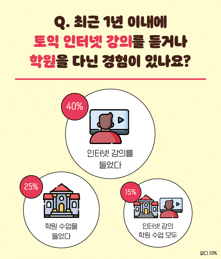 '토익 '인터넷 강의 vs 학원' 당신의 선택은?'이라는 주제로 지난 2월 20일부터 3월 12일까지 설문조사 이벤트가 진행되었습니다. 무려 5,000명이나 되는 많은 분이 설문에 참여해 주셨는데요. 인터넷 강의 또는 학원에서 토익을 공부하고 있거나 계획하고 있다면 이번 설문조사 결과를 주목하세요!
