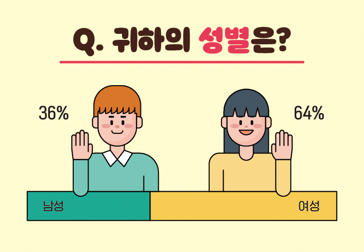 이번 설문에서는 '대학생, 대학원생'의 응답률이 35%로 가장 높았습니다. '취업준비생'과 '직장인'이 각 31%, 29%로 근소한 차이를 보이며 뒤를 이었는데요. '고등학생'이 2%로 가장 적었습니다. 남녀의 성비는 남자가 36%, 여성이 64%가 이번 설문에 참여했습니다.