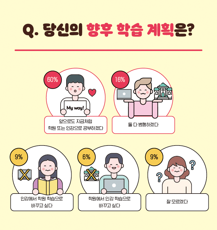 향후 학습계획을 묻는 질문에는 현재 자리잡은 학습 방법을 고수하려는 '지금처럼 공부한다'는 답변이 60%로 가장 많았습니다. 두 학습방법의 부족한 점을 서로 보완할 수 있게 '둘 다 병행하겠다'는 답변은 16%로 뒤를 이었네요. '인강에서 학원으로' 또는, '학원에서 인강으로' 학습방법을 바꾸겠다는 답변은 각각 9%, 6%로 나타났습니다.