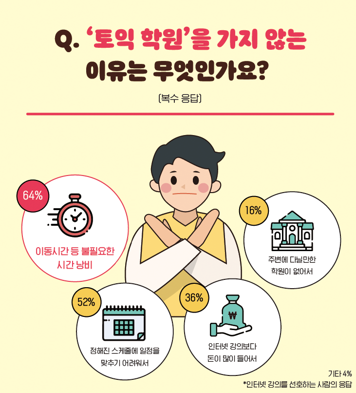 인강으로 학습하는 사람은 시간과 공간의 제약 때문일 거라 예상했는데, 예상대로 '이동시간 등 불필요한 시간 낭비' 때문에 학원을 가지 않는다고 답변한 비율이 64%나 되었습니다. 그 밖에도 '정해진 스케줄에 일정을 맞추기 어렵다(52%)', '인터넷 강의보다 돈이 많이 든다(36%)'는 답변이 있었는데요. '다닐만한 학원이 없어서' 어쩔 수 없이 인강으로 학습을 하는 응답자도 16%나 되었습니다.