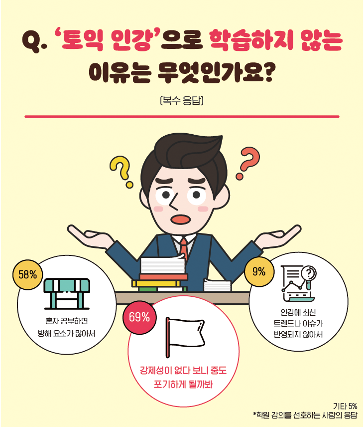 인강보다 학원을 선호하는 사람의 경우, 인강으로 공부할 경우 '강제성이 없다보니 중도 포기하게 될까봐' 학원을 선호한다는 답변이 69%나 되었습니다. 아무래도 혼자 공부하게 되면 스마트폰 등 '방해할 수 있는 요소가 많아서'라는 답변도 58%로 나타났네요. 인강의 경우 촬영본을 오랜 기간 사용하다보니 '최신 트렌드나 이슈를 반영하지 못하기 때문'이라는 답변이 9%로 뒤를 이었습니다.