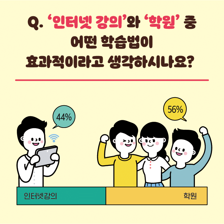 1년 이내에 인터넷 강의를 들었다는 사람이 40%나 되었지만 실제로 학원 강의가 더 효과적이라고 생각하는 답변이 전체 응답자의 56%로 나타났습니다. 아마도 학원이 효과적인 것은 알지만 인터넷 강의로 수업을 들어야하는 응답자들이 많았던 것으로 예상됩니다. 반면 인터넷 강의가 효과적이라는 응답자도 적지 않았는데요. 44%가 '인터넷 강의'라고 응답했습니다.
