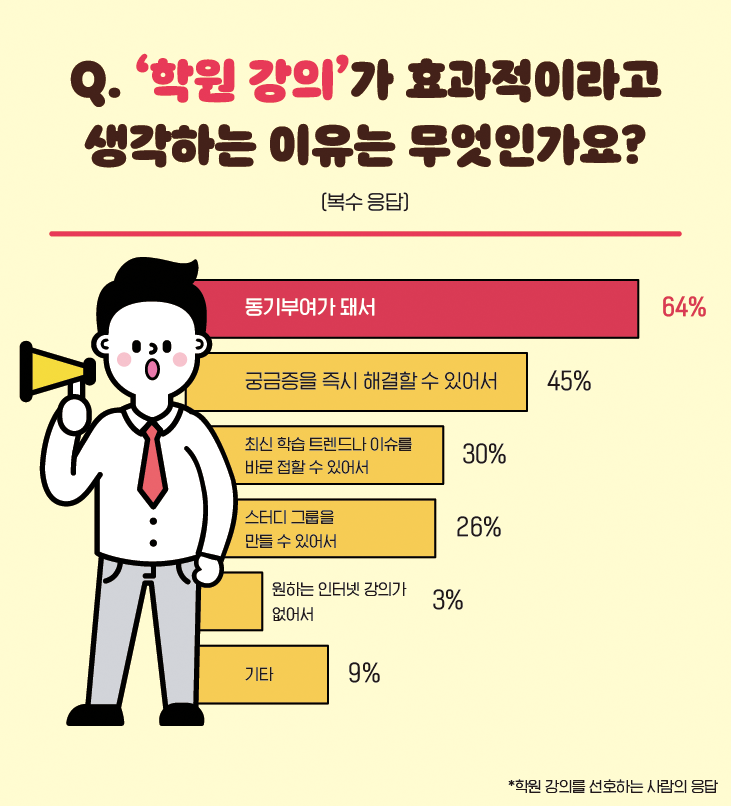 반면, '학원 강의가 효과적'이라고 생각하는 응답자들, 그 이유는 무엇일까요? 학원을 가는데 있어 가장 중요하다고 생각하는 것이 바로 '학습자의 동기부여' 때문이라고 답변한 비율이 64%로 나타났습니다. 주변의 다른 학습자와의 경쟁 심리, 면학 분위기 등에 자극을 받을 수 있기 때문인 것으로 예상됩니다. 강사에게 궁금한 점을 바로 질문할 수 있는 '궁금증 즉시 해결'이 45%로 뒤를 이었고, '최신 학습 트렌드나 이슈를 바로 접할 수 있어서(30%)', '스터디 그룹을 만들 수 있어서(25%)', '원하는 강의가 인강에는 없어서(3%)' 순으로 나타났습니다.