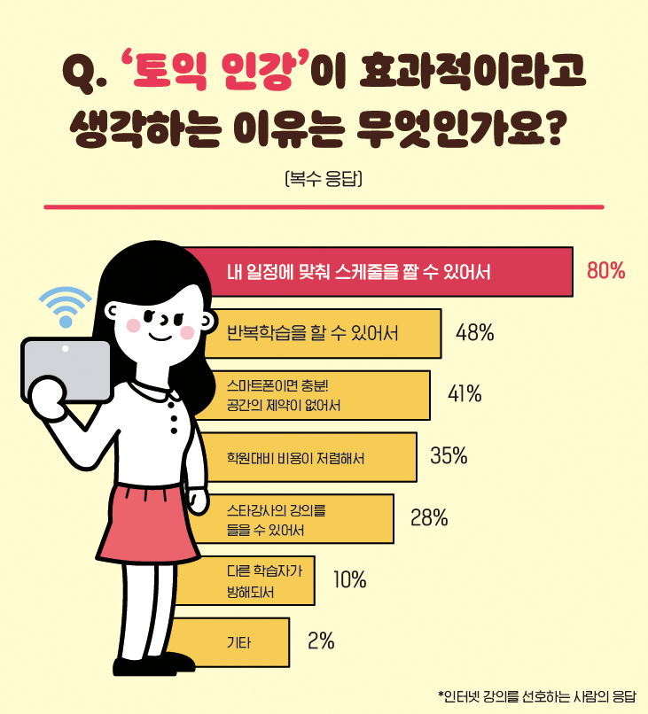 토익 인터넷 강의를 선호하는 사람의 응답으로 '토익 인강이 효과적이라고 생각하는 이유'를 물었는데요. 무엇보다 '내 일정에 맞춰 스케줄을 짤 수 있어서'라는 응답이 80%로 가장 높게 나타났습니다. 뒤를 이어 '반복학습을 할 수 있어서(48%)', '공간의 제약이 없어서(41%), '학원대비 비용이 저렴해서(28%)', '다른 학습자가 방해되서(10%)', '기타(2%)' 순의 답변이 있었습니다.