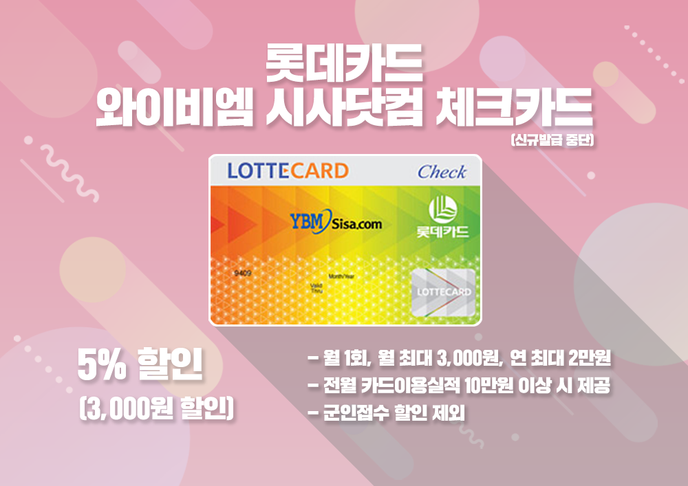'롯데카드 와이비엠 시사닷컴 체크카드'는 토익스피킹 응시료가 5% 할인됩니다. 전월 카드실적이 10만원 이상이라는 타 카드에 비해 낮은 사용 실적으로 혜택을 받을 수 있습니다. 월 1회, 최대 3,000원 금액을 할인해주며, 연 최대 2만원까지 사용 가능합니다. 이 카드 역시 현재 신규발급은 중단되었지만 해당 카드를 소지하고 있다면 활용할 수 있습니다. 군인접수는 할인에서 제외된다는 점 참고 바랍니다.