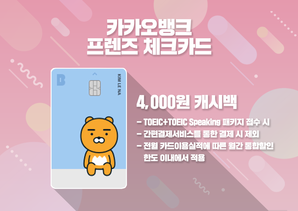 '카카오뱅크 프렌즈 체크카드'는 4,000원 캐시백 혜택을 제공하고 있습니다. 결제 시 주의할 점은 TOEIC Speaking 단독으로는 캐시백 혜택을 받을 수 없는데요. TOEIC과 TOEIC Speaking 패키지로 접수하게 되면 적용되니 결제 시 참고 바랍니다. 간편 결제 서비스로 결제하게 되면 캐시백 혜택을 받을 수 없으니 결제 방법을 꼼꼼히 확인하세요!