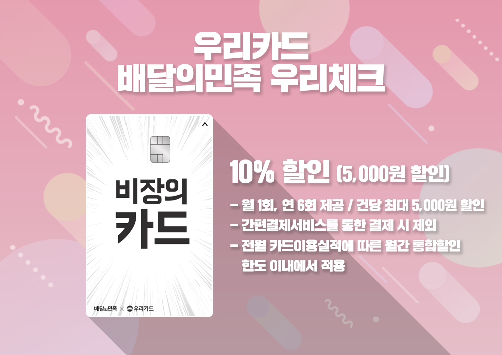 '우리카드 배달의민족 우리체크' 카드로 결제할 경우 토익스피킹 응시료를 최대 5,000원 한도 내에 할인을 받을 수 있습니다. 연 1회, 연 6회 할인이 되니 참고하시고요. 간편 결제 서비스를 통한 결제 시는 할인 적용이 되지 않으며 전월 카드 이용실적에 따른 월간 통합할인한도 이내에서만 혜택을 받을 수 있습니다. 보유하고 있는 카드의 이용실적과 통합할인한도를 확인하세요!