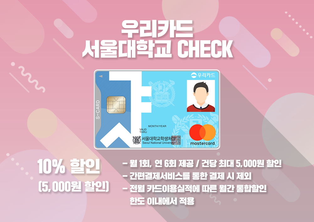 '우리카드 서울대학교 CHECK' 카드로 결제할 경우 토익스피킹 응시료를 최대 5,000원 한도 내에 할인을 받을 수 있습니다. 연 1회, 연 6회 할인이 되니 참고하시고요. 간편 결제 서비스를 통한 결제 시는 할인 적용이 되지 않으며 전월 카드 이용실적에 따른 월간 통합할인한도 이내에서만 혜택을 받을 수 있습니다. 보유하고 있는 카드의 이용실적과 통합할인한도를 확인하세요!