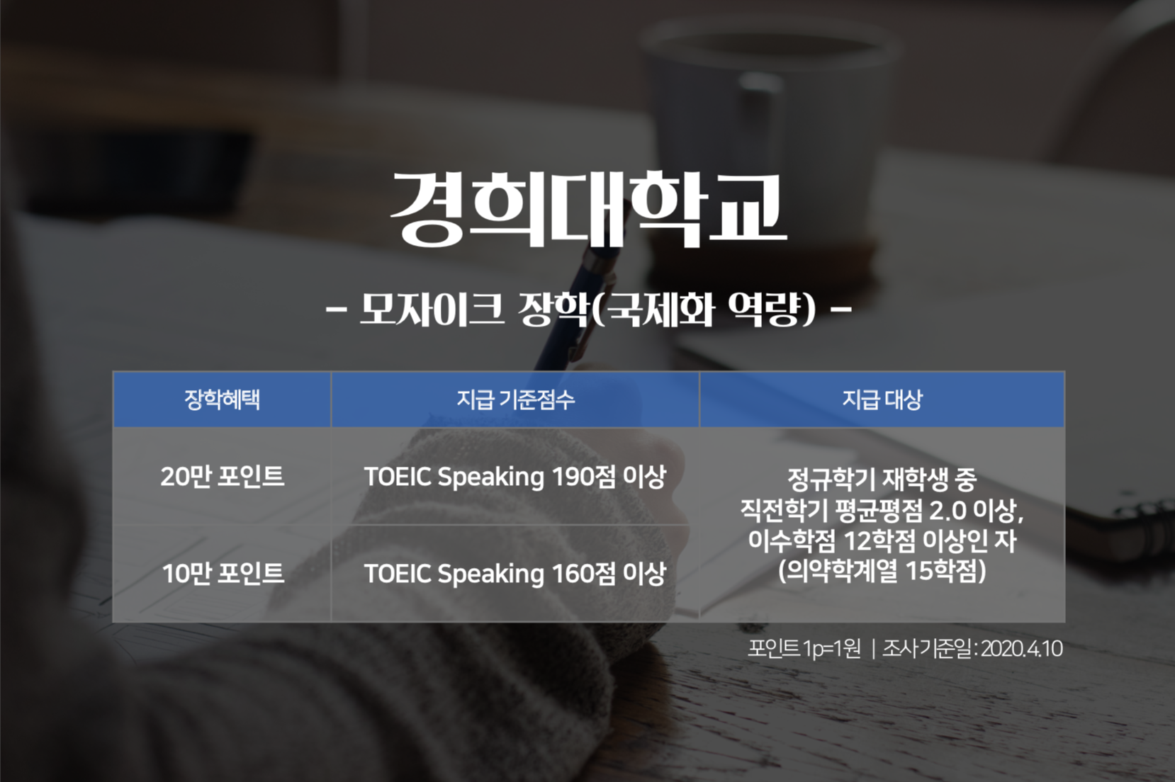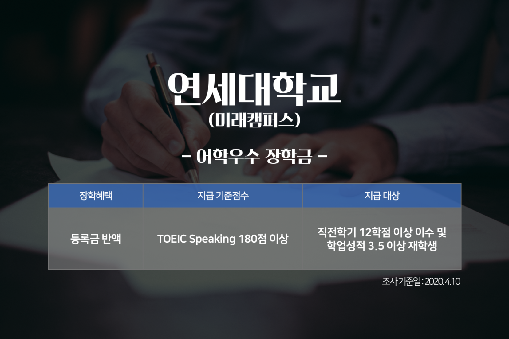 내가 다니는 학교가 토익스피킹 성적으로 장학금을 지급하고 있다는 내용을 처음 확인한 분들도 계실텐데요. 예외사항이 발생할 수 있으므로 장학금 수혜 조건 등 자세한 내용은 각 대학의 홈페이지나 직접 문의를 통해 확인하시기 바랍니다. 토익스피킹 시험으로 취업을 위한 어학점수도 준비하고, 대학 장학금까지 챙기는 1석 2조의 혜택! 놓쳐서는 안되겠죠?