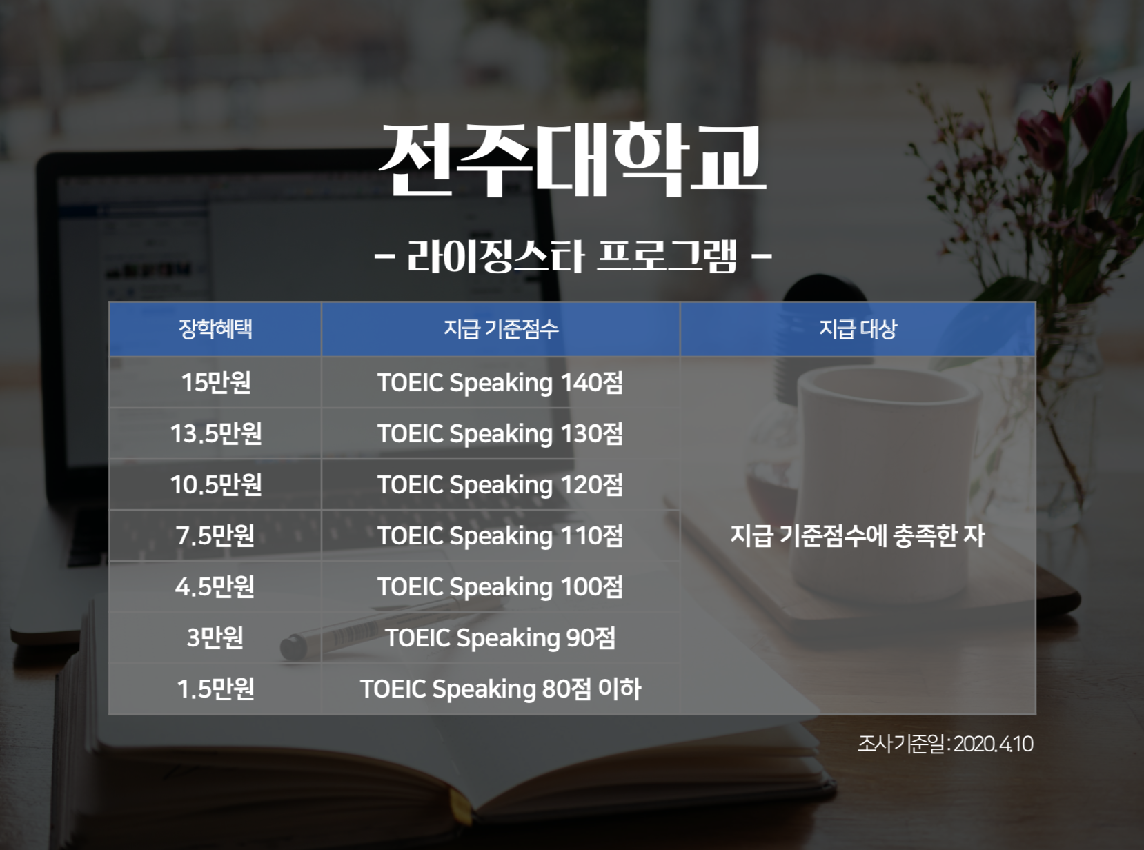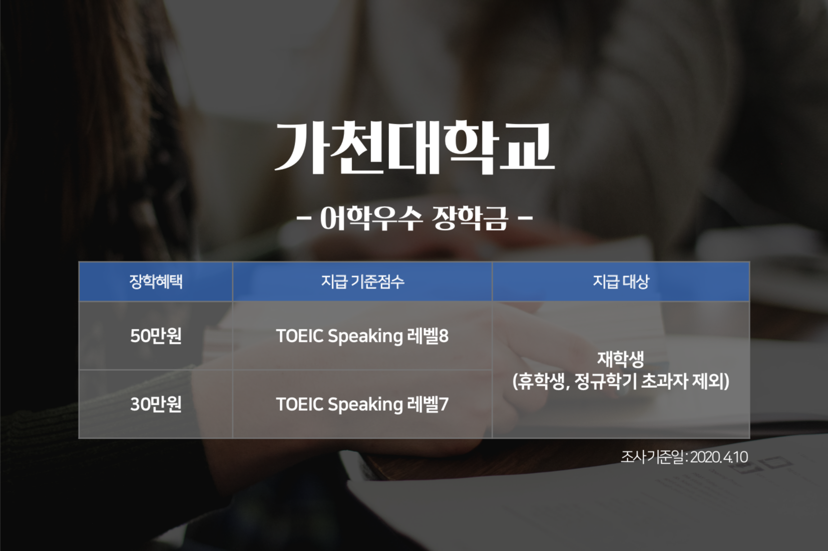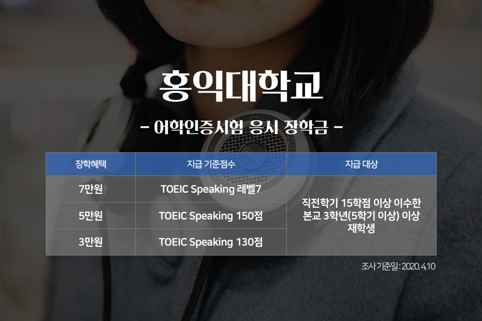 토익스피킹 시험은 언제 치를까요? 취업을 위해서, 혹은 대학 졸업 전에 시험을 보겠다는 분들이 많을텐데요. 토익스피킹 성적으로 지금 재학 중인 대학교의 장학금을 받을 수 있다는 사실 알고 계셨나요? 토익스피킹 성적으로 장학금 혜택보기는 1학년 때부터! 지금부터 <토익스토리>가 각 대학별 '토익스피킹 성적 장학금' 정보를 전해드립니다. 지급 기준 점수를 꼼꼼히 확인해보세요!