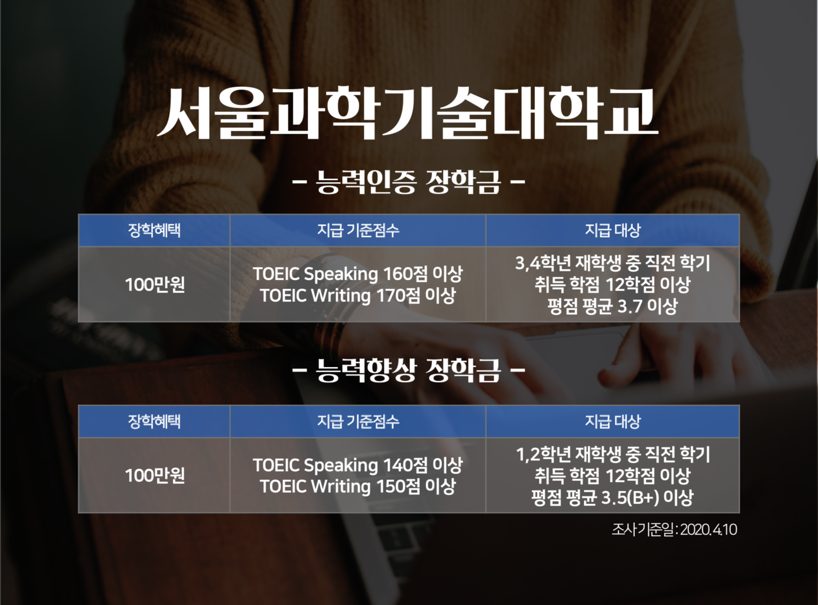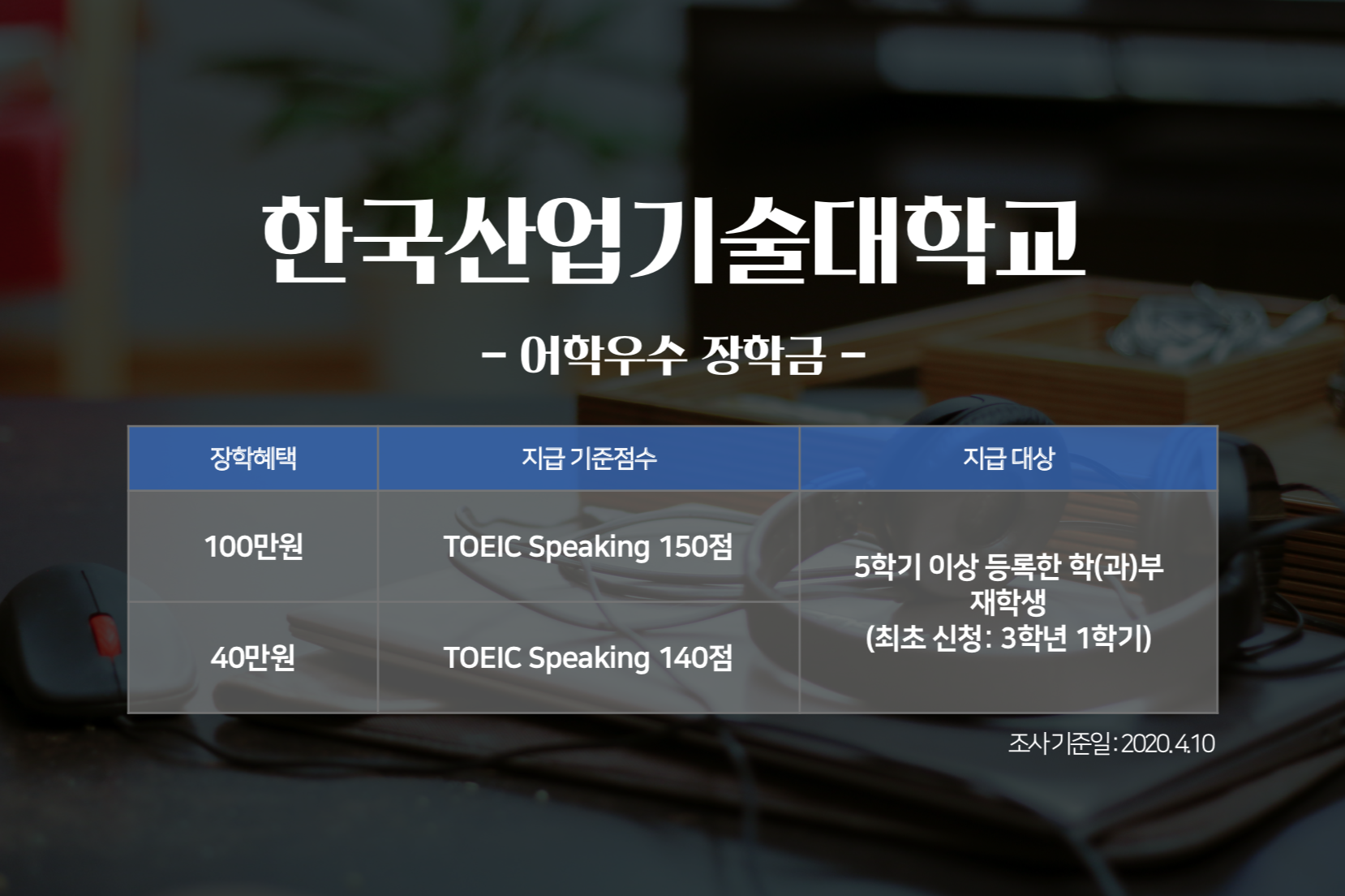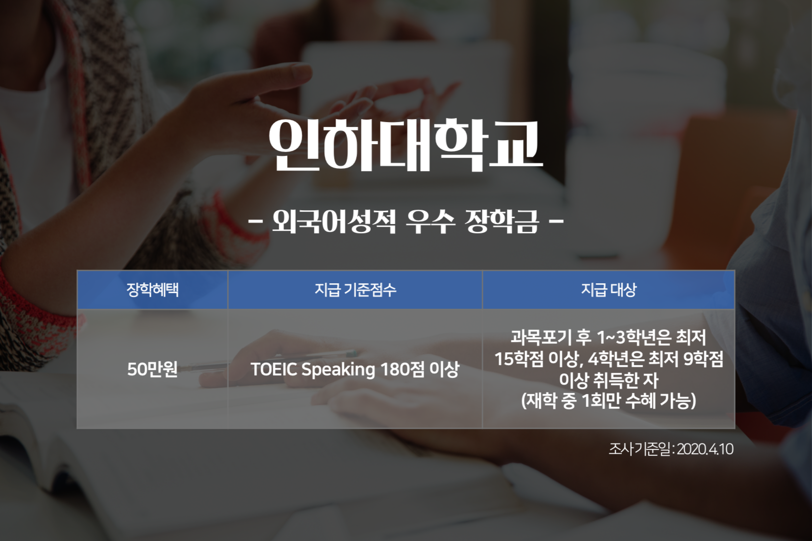 토익스피킹 시험은 언제 치를까요? 취업을 위해서, 혹은 대학 졸업 전에 시험을 보겠다는 분들이 많을텐데요. 토익스피킹 성적으로 지금 재학 중인 대학교의 장학금을 받을 수 있다는 사실 알고 계셨나요? 토익스피킹 성적으로 장학금 혜택보기는 1학년 때부터! 지금부터 <토익스토리>가 각 대학별 '토익스피킹 성적 장학금' 정보를 전해드립니다. 지급 기준 점수를 꼼꼼히 확인해보세요!