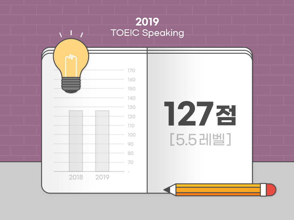 2019년 TOEIC Speaking 정기시험 평균 성적은 127점(5.5레벨)으로 지난 2018년과 동일한 수준으로 나타났습니다. 2015년부터 확인해보면 123점(5.3레벨), 2016년과 2017년에는 125점(5.4레벨)로 2년마다 2점씩 증가하는 추세입니다.