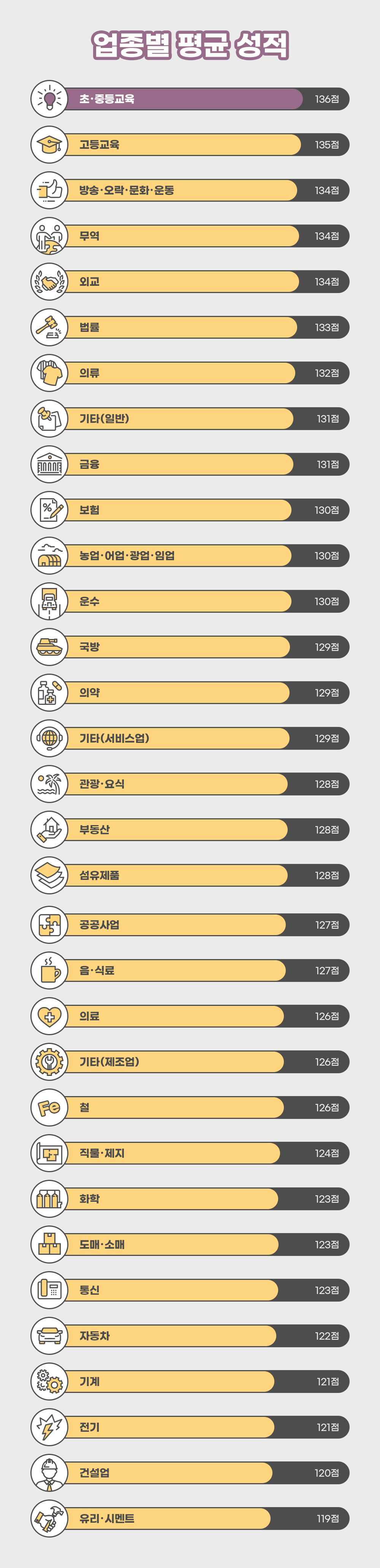 업종별 평균 성적은 어떨까요? 1위와 2위가 각각 '초중등교육(136점)', '고등교육(135점)'으로 '교육' 분야가 업종별 평균 성적에서 가장 높은 점수를 기록했습니다. 방송·오락·문화·운동 부분이 134점으로 3위, 이어 '무역', '외교', '법률', '의류', '금융' 등의 업종이 130점 이상의 상위권 업종으로 나타났습니다.