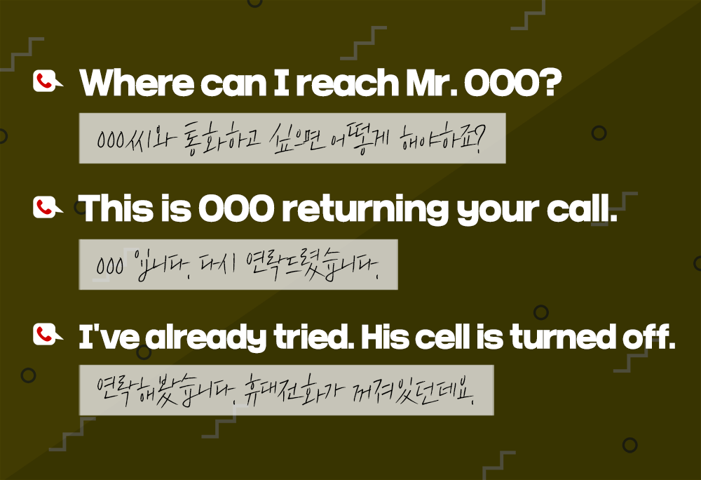 이제 전화 걸 때 쓰는 몇 가지 표현을 알아볼까요? 전화로 누군가를 찾을 때는 'look for'나 'want to talk'보다 '누구와 통화하고 싶다, 방법을 알고 싶다'는 의미로 'Where can I reach [통화하고 싶은 사람]'이라고 합니다. 그리고 부재중 메시지를 받고 회신할 때는 'returning your call'이라고 표현할 수 있습니다.