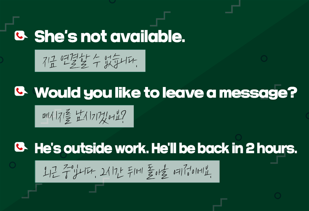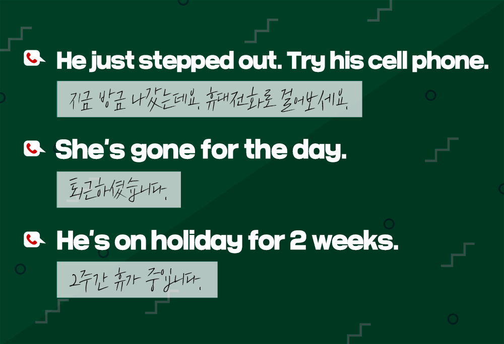 다양한 이유로 담당자가 통화가 어려울 때, '지금은 통화가 어렵다'는 의미로 'He/She is not available'이라고 표현할 수 있는데요. 'He's not here'라고도 간단히 이야기할 수 있습니다. 담당자가 없을 때는 메모를 남겨주는 것이 예의! 메시지를 남기겠냐고 물어볼 때는 'Would you like to leave a message?'라고 말합니다.