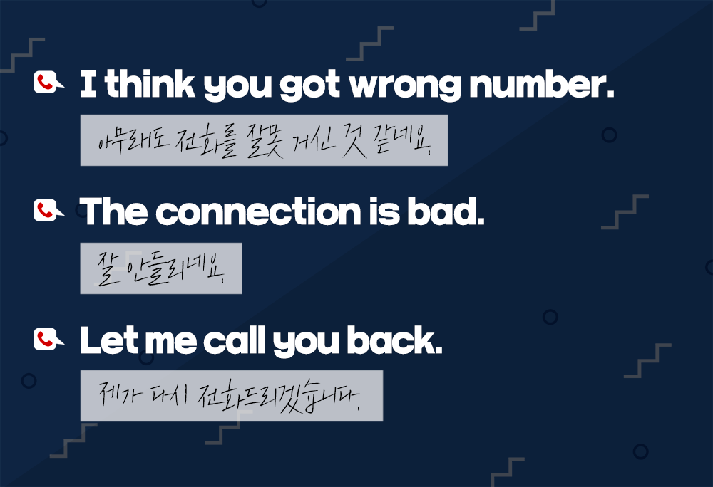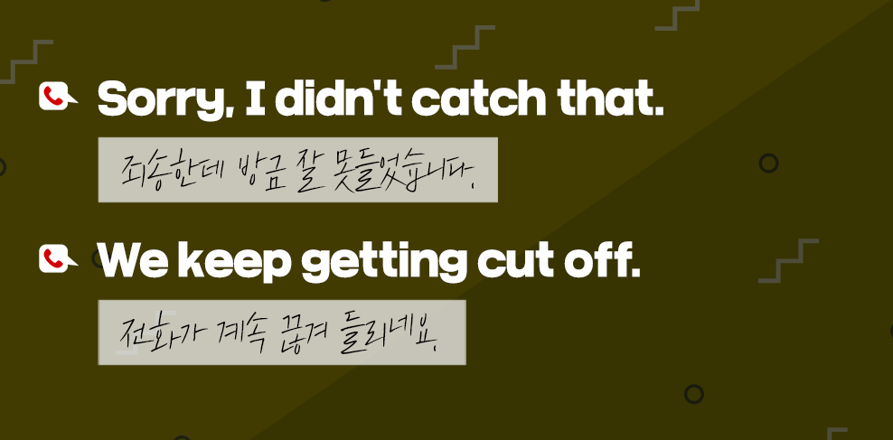 전화로 대화하다 보면 회선 또는 발음 문제로 잘 듣지 못할 때가 있죠? 그럴 때는 '다시 말해줄래?'라는 직접적인 표현보다 '나 방금 못 들었어'라는 의미로 'I didn't catch that'이라고 표현하는 게 좋습니다. 회선 상태가 불안해서 끊길 때는 'We keep getting cut off.'라고 이야기합니다. 그렇게 메시지 전달이 잘 안될 때는? 전화를 끊다는 의미의 'hang up'이라는 표현을 사용해 'Hang up the phone, I'll call you back immediately.(전화를 끊어보세요. 제가 지금 바로 다시 걸게요.)'라고 말할 수 있습니다.