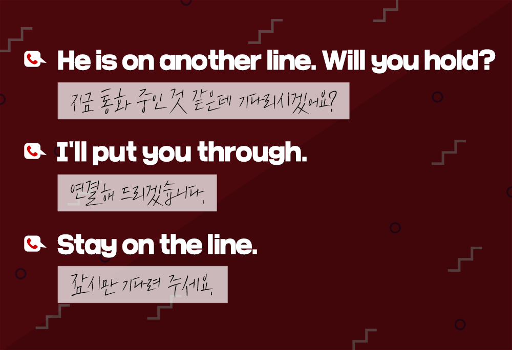 다른 사람의 전화를 당겨 받을 때도 있죠? 그때는 '담당자가 지금 통화 중인 것 같다'는 의미로 'He/She is on another line'이라고 말합니다. 여기서 'line'은 전화 회선을 의미하죠. 잠시만 기다려 달라는 의미에서 'Stay on the line.'이라고 이야기할 수 있습니다.