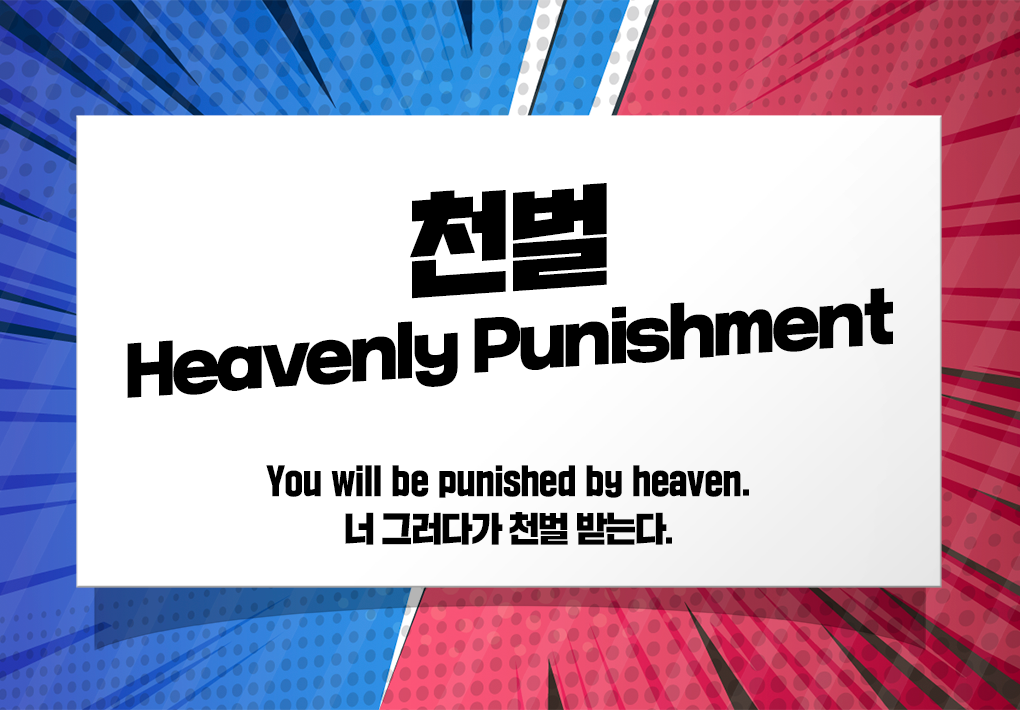 온갖 나쁜 짓을 일삼는 '빌런'은 언젠가 '천벌'을 받게 되겠죠? '천벌'은 말 그대로 'Heavenly Punishment(천국의 형벌)'이라고 표현합니다. '너 그런 짓 하다가 천벌 받는다'라고 말할 때 'You might be punished by heaven for doing such a things.'라고 할 수 있겠죠. 'Divine Punishment(신의 형벌)'이라고 표현하기도 합니다.