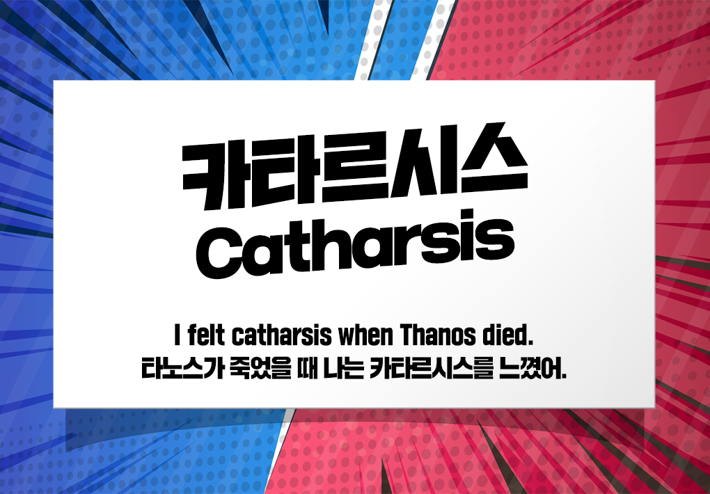 영어 문장으로 표현하면 'I felt catharsis when Thanos died. (타노스가 죽었을 때 나는 카타르시스를 느꼈어.)'라고 합니다. '카타르시스'라는 단어를 모른더라도 대신 'gloat over'를 사용하면 되는데요. '흡족해 하다, 고소해 하다'라는 뜻으로 'I gloated over when Thanos died.'라고 카타르시스를 대체할 수 있습니다.