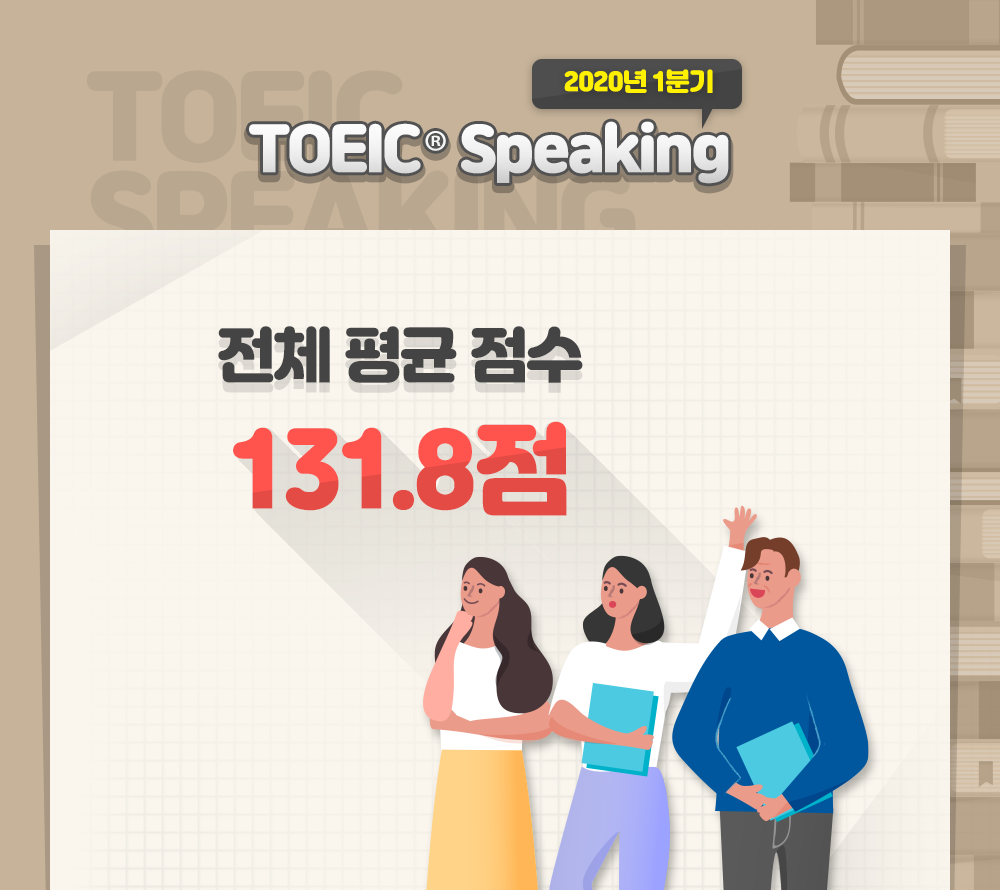 2020년 1분기 TOEIC Speaking 정기시험 평균 성적은 131.8점으로 2019년 전체 평균인 127점보다 약 4점 가량 높게 나타났습니다.