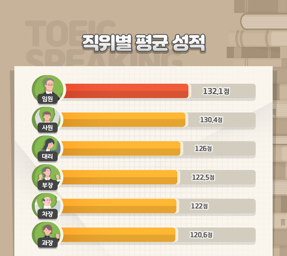 직위별로 살펴보면 '임원'이 평균 132.1점을 받았습니다. 이어 '사원'이 130.4점, '대리'가 126점, '부장'이 122.5점, '차장'이 122점, 마지막으로 '과장'이 120.6점을 획득해 직장인 TOEIC Speaking 응시자 중 '임원'이 가장 높은 점수를 획득한 것으로 확인되었습니다.