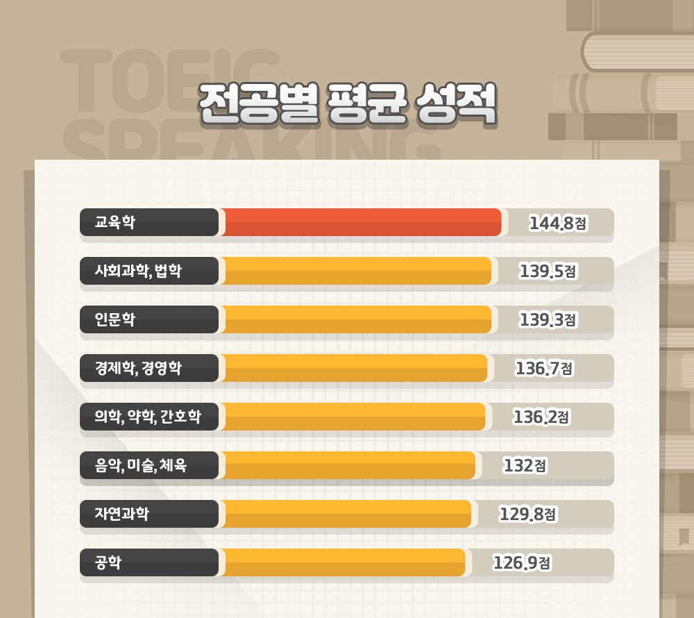 전공별로 살펴보면 '교육학' 전공자가 144.8점, 사회과학/법학 전공자가 139.5점, 인문학 전공자가 139.3점, 경제학/경영학 전공자가 136.7점, 의학/약학/간호학 전공자가 136.2점, 음악/미술/체육 전공자가 132점, 자연과학과 공학 전공자가 각각 129.8점, 126.9점을 기록해 이공계열 전공자의 점수가 상대적으로 낮은 점수를 보였습니다.