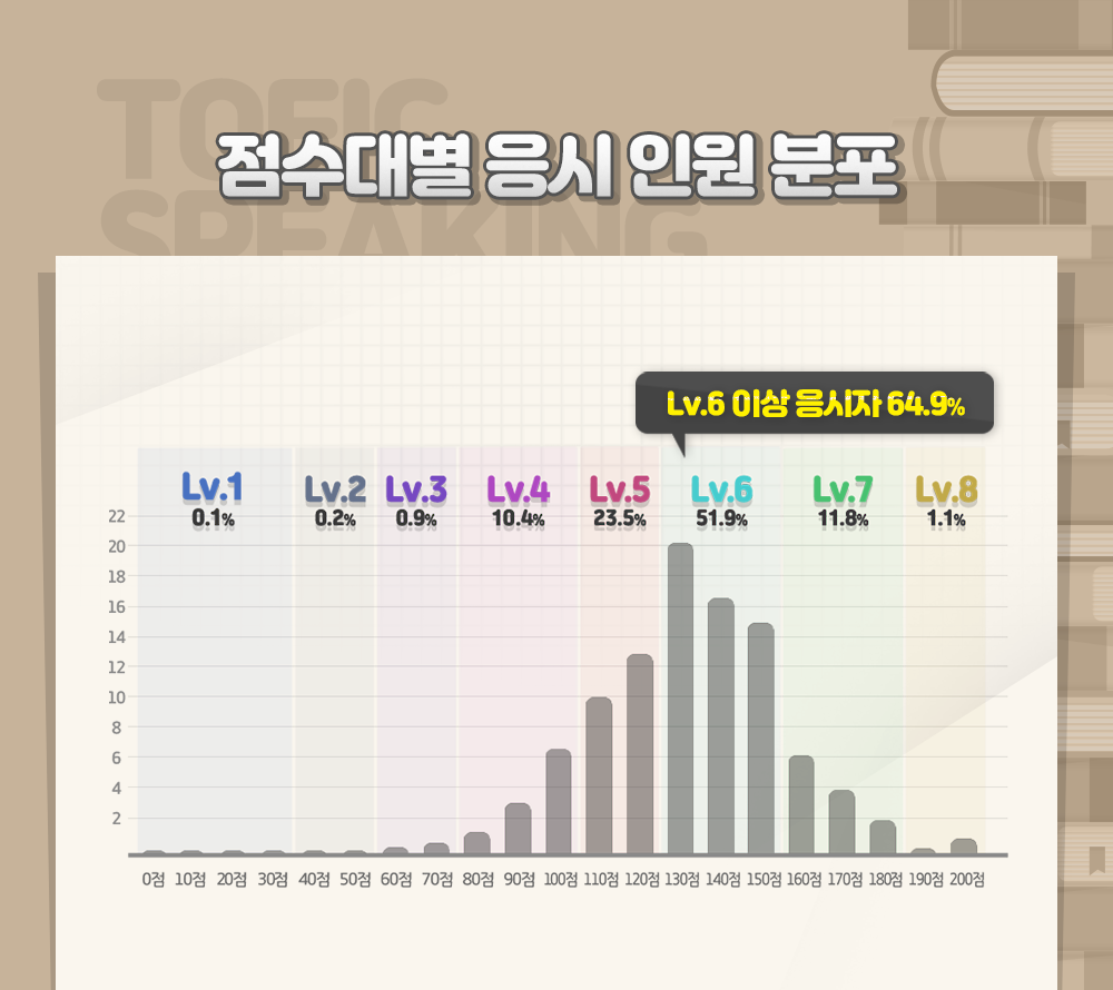 점수대별 응시 인원 분포를 살펴보면 응시자 5명 중 3명, 총 64.9%가 레벨6 이상의 점수를 달성했습니다. 레벨 기준으로 보면 0~30점에 해당하는 레벨1이 총 0.1%, 40~50점에 해당하는 레벨2가 총 0.2%, 60~70점에 해당하는 레벨 3이 총 0.9%, 80~100점에 해당하는 레벨4가 10.4%, 110~120점에 해당하는 레벨5가 23.5%의 분포를 보였는데요. 가장 많은 점수를 획득학 인원은 130~150점에 해당하는 레벨6에 가장 많이 분포되었고 응시 인원 비율은 51.9%나 되었습니다. 160~180점에 해당하는 레벨7은 총 11.8%를, 마지막으로 가장 높은 레벨인 190~200점의 레벨8은 1.1%의 분포를 기록했습니다.