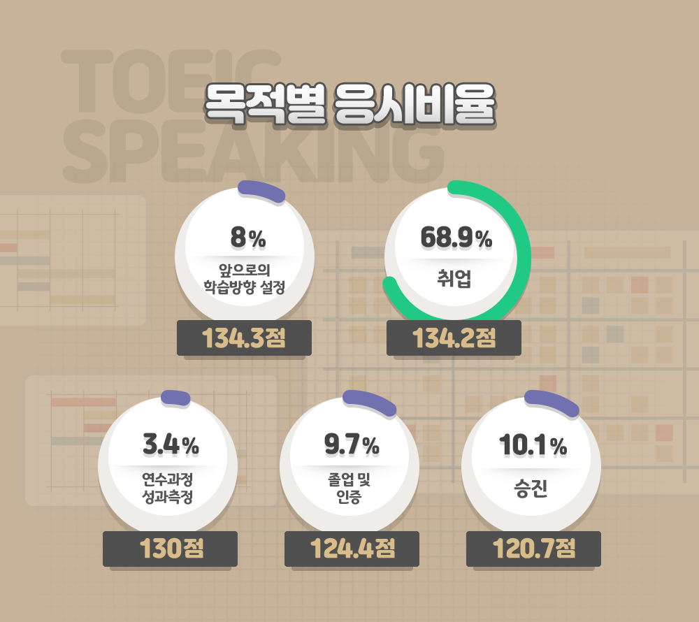 TOEIC Speaking에 응시한 수험생은 어떤 목적으로 시험을 치렀을까요? TOEIC Speaking 응시 목적을 '취업'이라고 답한 비율이 68.9%로 압도적으로 높았는데요. 2019년 TOEIC Speaking 정기시험에서 '취업' 목적이 63%였던 것에 비하면 대폭 상승한 것으로 보입니다.