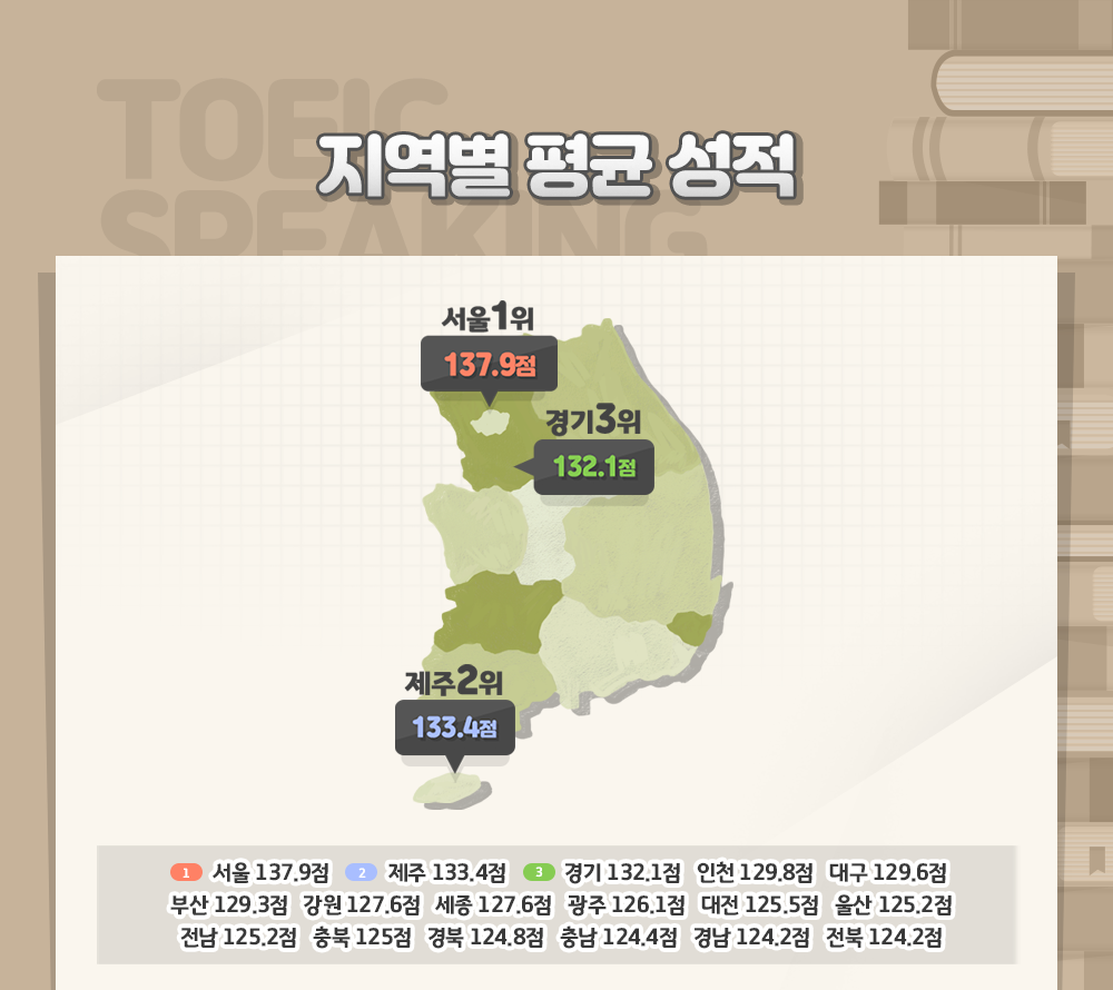 한편, 지역별로는 '서울-제주-경기' 순으로 가장 높은 점수 달성했습니다. '서울'이 137.9점으로 최고 점수를, 이어 '제주'가 133.4점, '경기'가 132.1점을 기록했습니다. 전체 17개 지역별 순위를 살펴보면 서울, 제주, 경기에 이어 인천, 대구, 부산, 강원, 세종, 광주, 대전, 울산, 전남, 충북, 경북, 충남, 경남, 전북 순으로 나타났으며 가장 낮은 점수를 받은 전북이 124.2점을 기록했습니다.