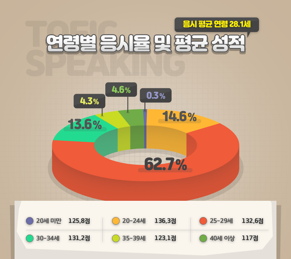 20~24세 TOEIC Speaking 응시율이 14.6%, 점수는 136.3점으로 가장 높은 점수를 받았습니다. 25~29세가 응시율 62.7%로 최다 응시, 점수는 132.6점으로 2위를 차지했고, 이어 점수 순으로 30~34세(13.6%)가 131.2점, 20세 미만(0.3%)이 125.8점, 35~39세(4.3%)가 123.1점이며, 40세 이상(4.6%)이 117점으로 가장 낮은 점수를 보였습니다.