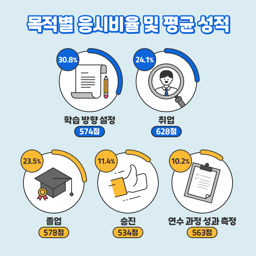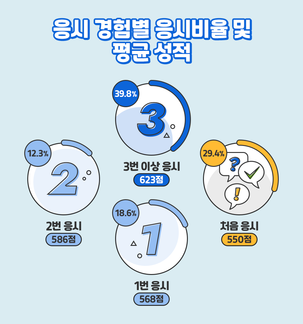어쩌면 많은 수험생들이 궁금해할 만한 질문! '응시 경험이 많으면 성적도 높을까?'라는 물음에 답이 될만한 통계가 있습니다. 설문에 응답하는 시점 이전에 '얼마나 많이 시험에 응시했는가'라는 질문에 전체 응답자의 39.8%가 '3번 이상 응시했다'고 답했는데요. 이들의 평균 성적은 623점으로 '응시 경험별 평균 성적' 부문에서도 가장 높았습니다. '2번 응시'자의 평균 성적은 586점, '1번 응시'자의 평균 성적으로 568점이었고 '이번이 처음'이라는 응시자의 점수는 550점으로 가장 낮았습니다.