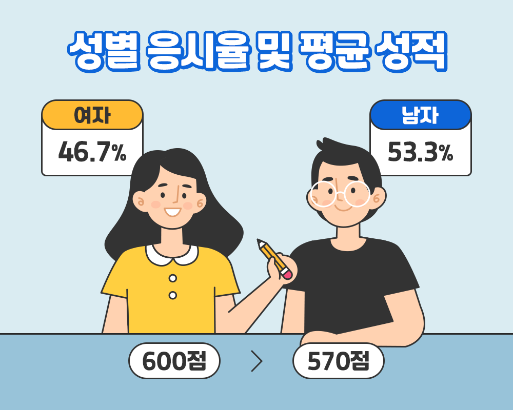 '성별 응시율과 평균 성적'은 어떨까요? 남성 53.3%, 여성 46.7%로 여성보다 남성이 6.6.% 더 많이 응시한 것으로 나타났습니다. 반면 평균 성적은 여성 600점, 남성 570점으로, 2018년과 같이 남성보다 여성이 30점 더 높았습니다.