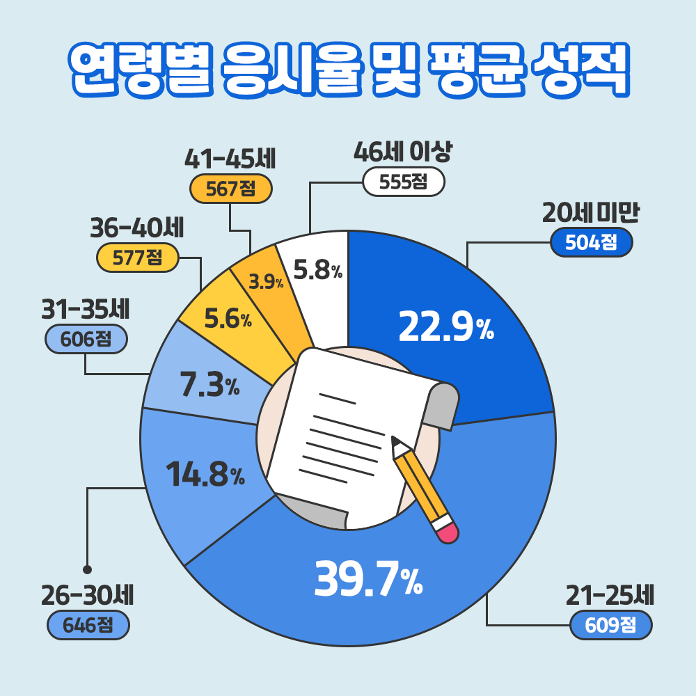 한편 연령별 평균 성적 부문에서는 2018년과 같이 '26~30세'의 평균 성적이 가장 높았는데요. 646점인 '26~30세'에 이어 '21~25세'(609점), '31~35세'(606점)가 각각 2, 3위를 차지했습니다.