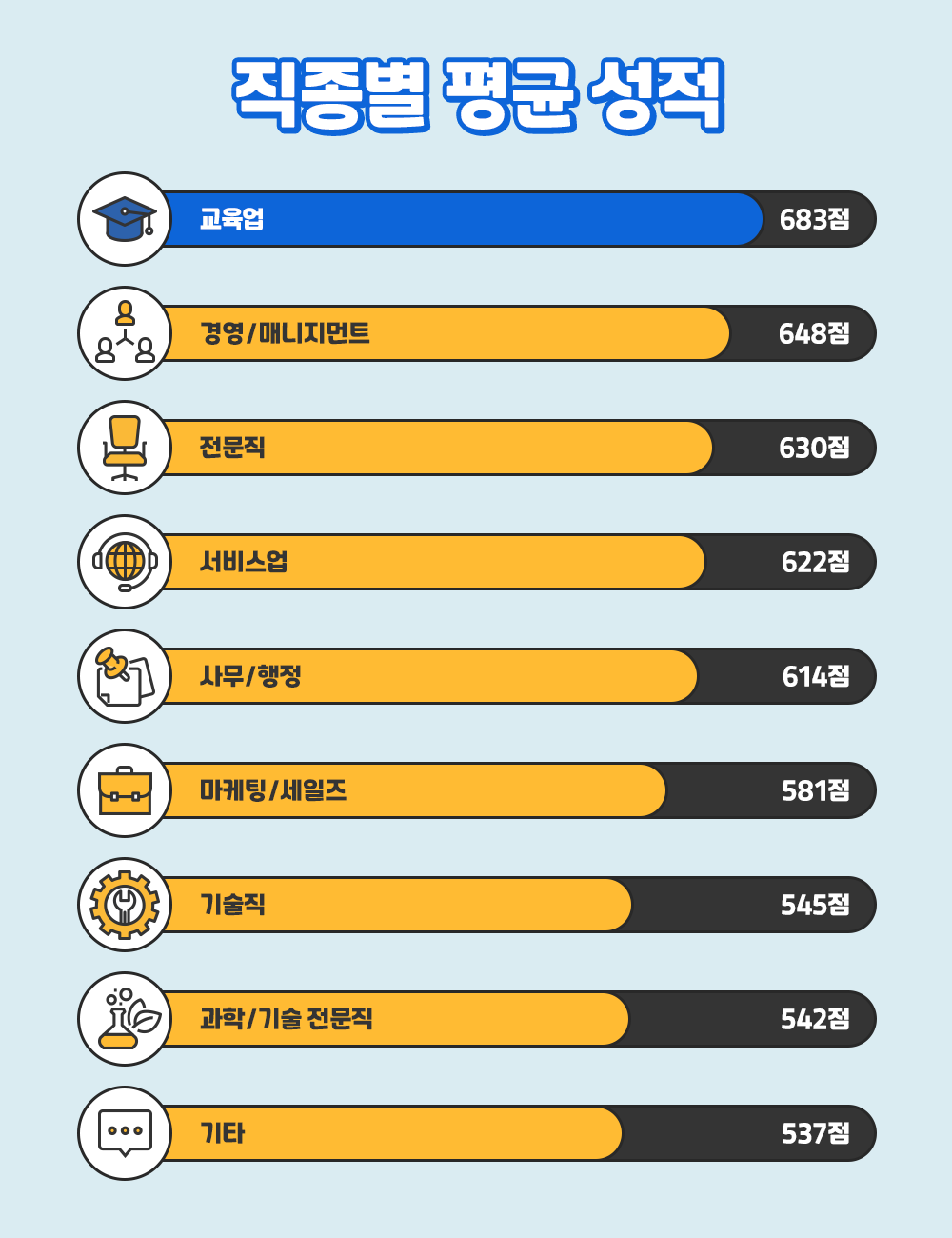 이번에는 토익 응시자 중 '고득점을 기록한 직종'을 살펴봤습니다. 평균 성적이 가장 높은 직종은 683점인 '교육업'이었는데요. 다음으로 '경영/매니지먼트'(649점), '전문직'(630점) '서비스업'(622점), '사무/행정'(614점), '마케팅/세일즈'(581점)', '기술직'(545점), '과학/기술직(542점)' 순이었습니다. 전체 순위는 2018년과 유사하나 항목별 점수가 소폭 상승했네요!