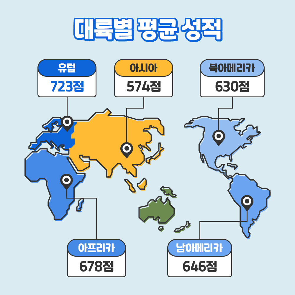 '대륙별 평균 성적' 1위는 723점인 '유럽'이 차지했습니다. 2위 아프리카(678점), 3위 남아메리카(646점), 4위 북아메리카(630점) 순으로 이어졌는데요. 한국이 속한 아시아의 평균 성적은 574점으로 5개 대륙 중 가장 낮았습니다. 아메리카와 아프리카의 평균 성적은 2018년보다 각 10점, 1점 하락했고, 다른 대륙들의 평균 성적은 2~11점 상승했네요!