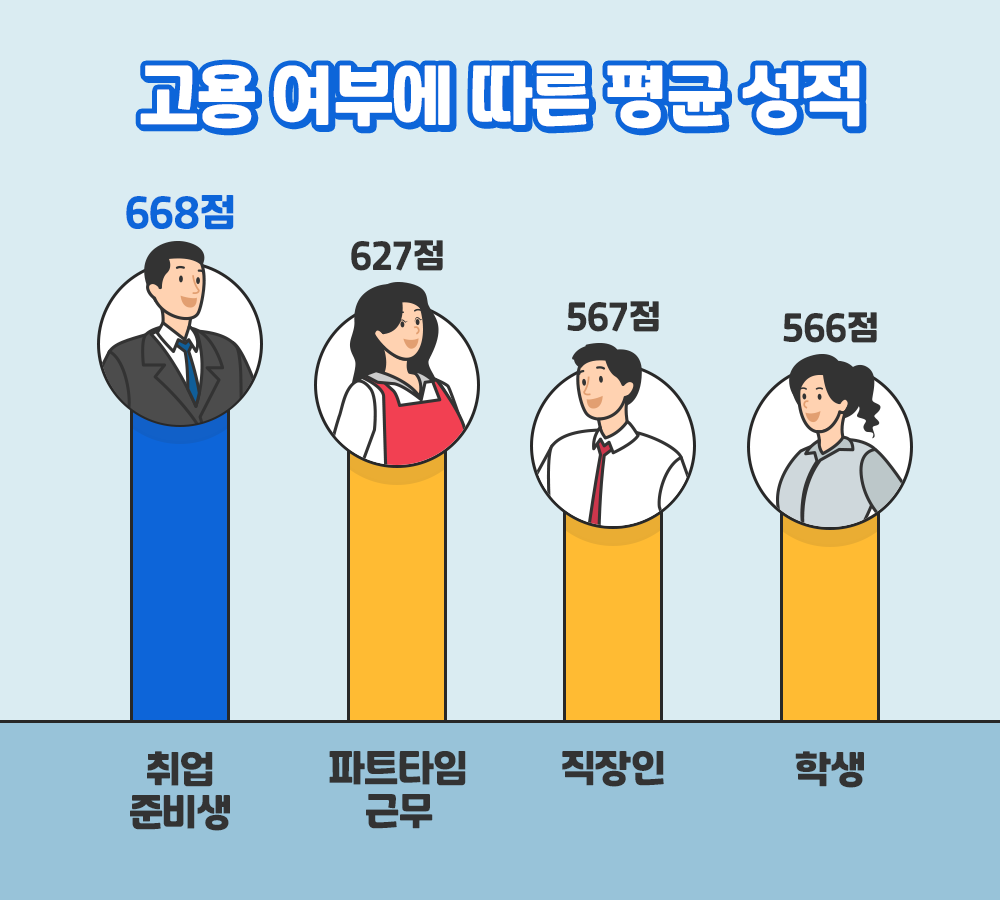 '고용 여부'에 따른 토익 성적 통계도 흥미로웠는데요. '취업준비생(무직)', '파트타임(아르바이트 등)', '직장인', '학생' 중 누구의 성적이 가장 높을까요? 바로바로 '취업준비생'의 성적이 669점으로 가장 높았습니다. 이어 '파트타임 근무자' 627점, '직장인' 567점, '학생' 566점 순으로 높게 나타났습니다.